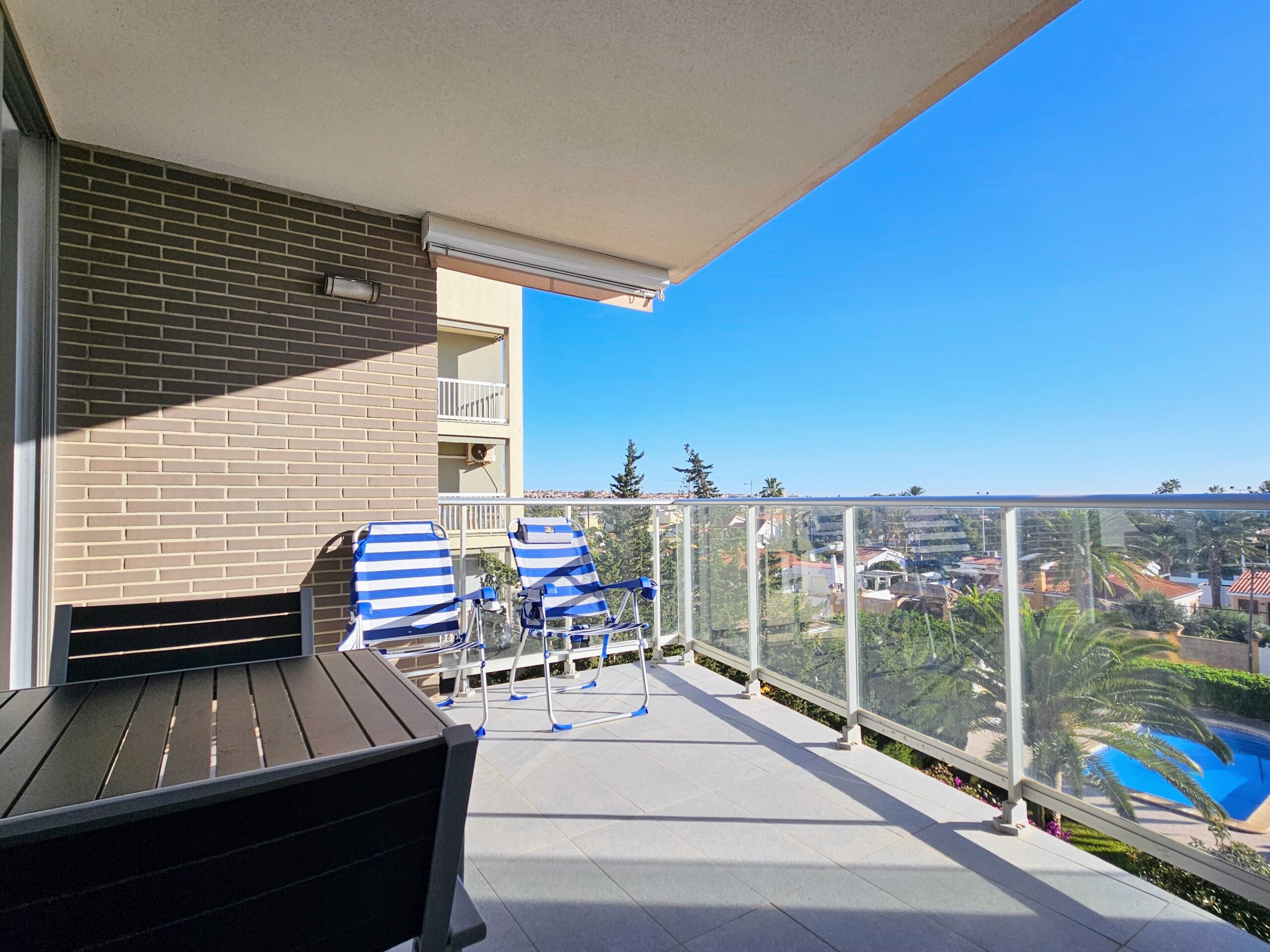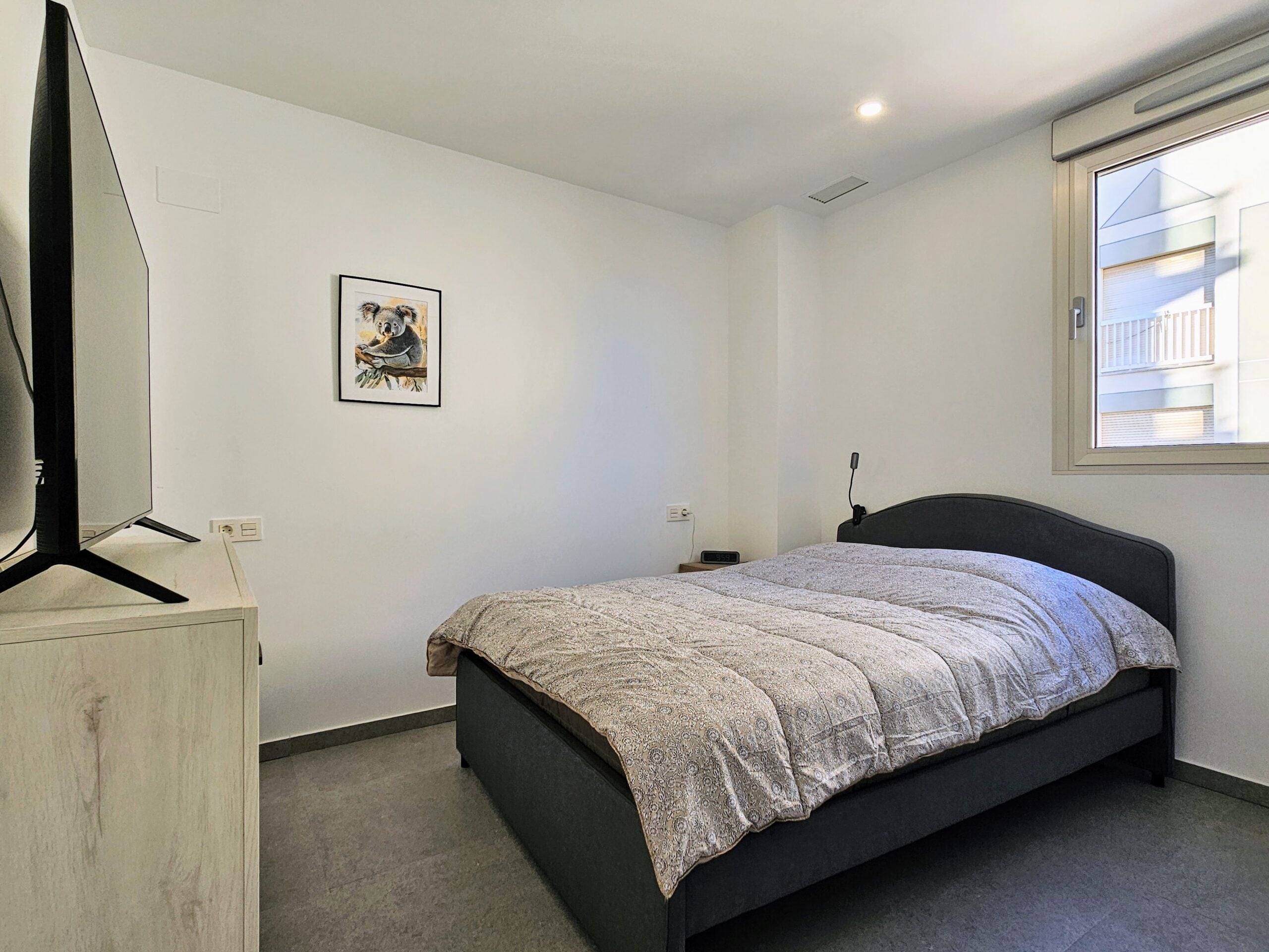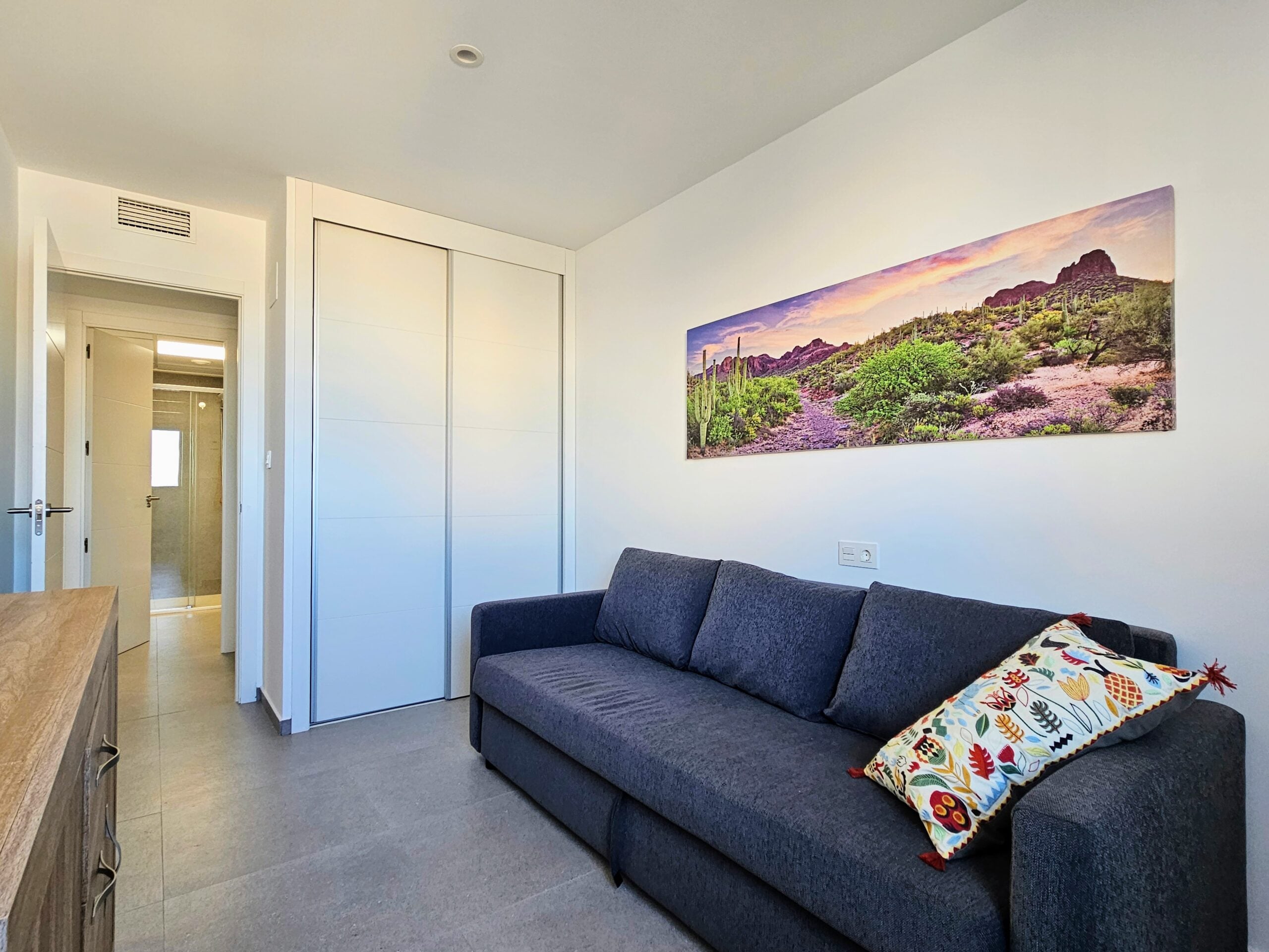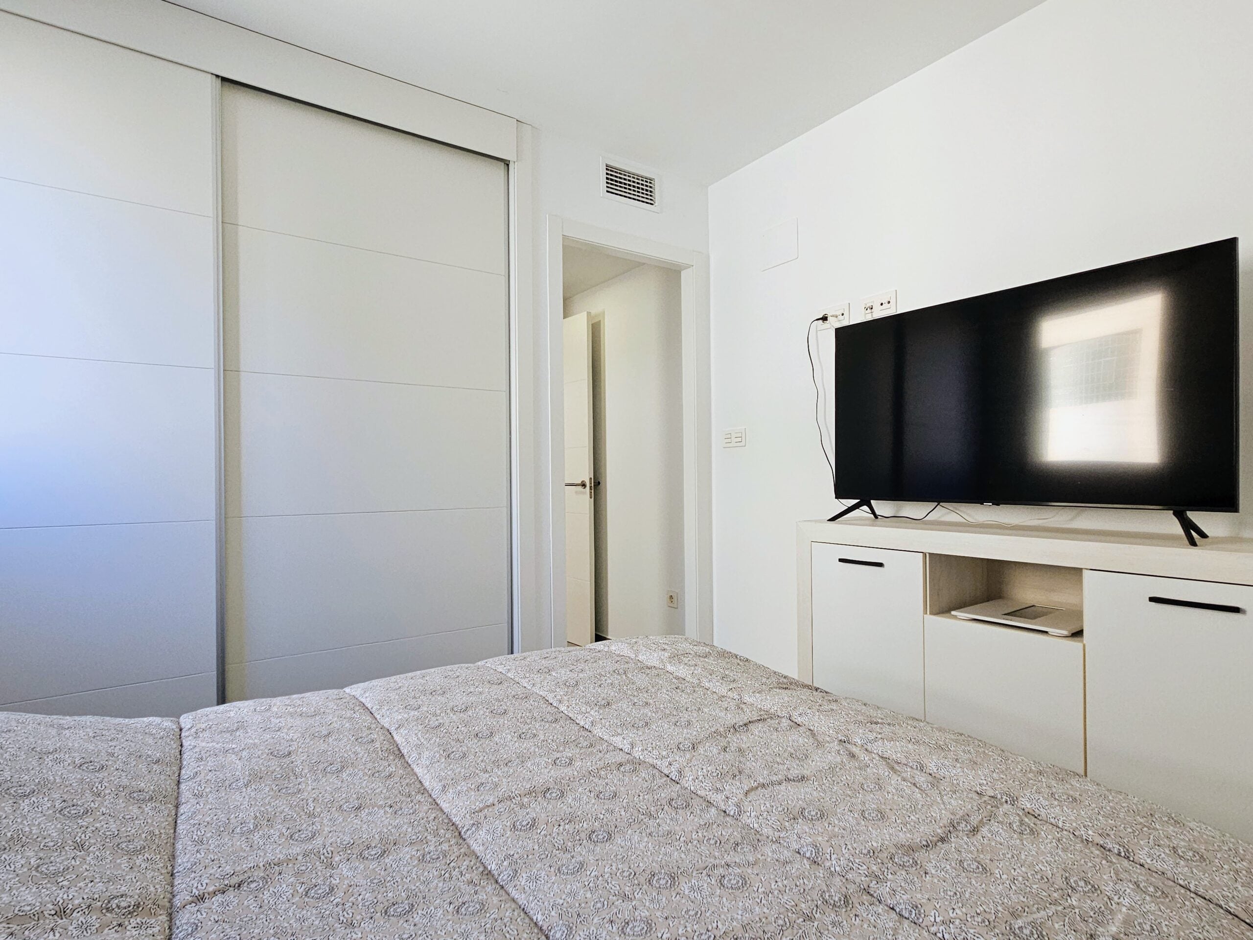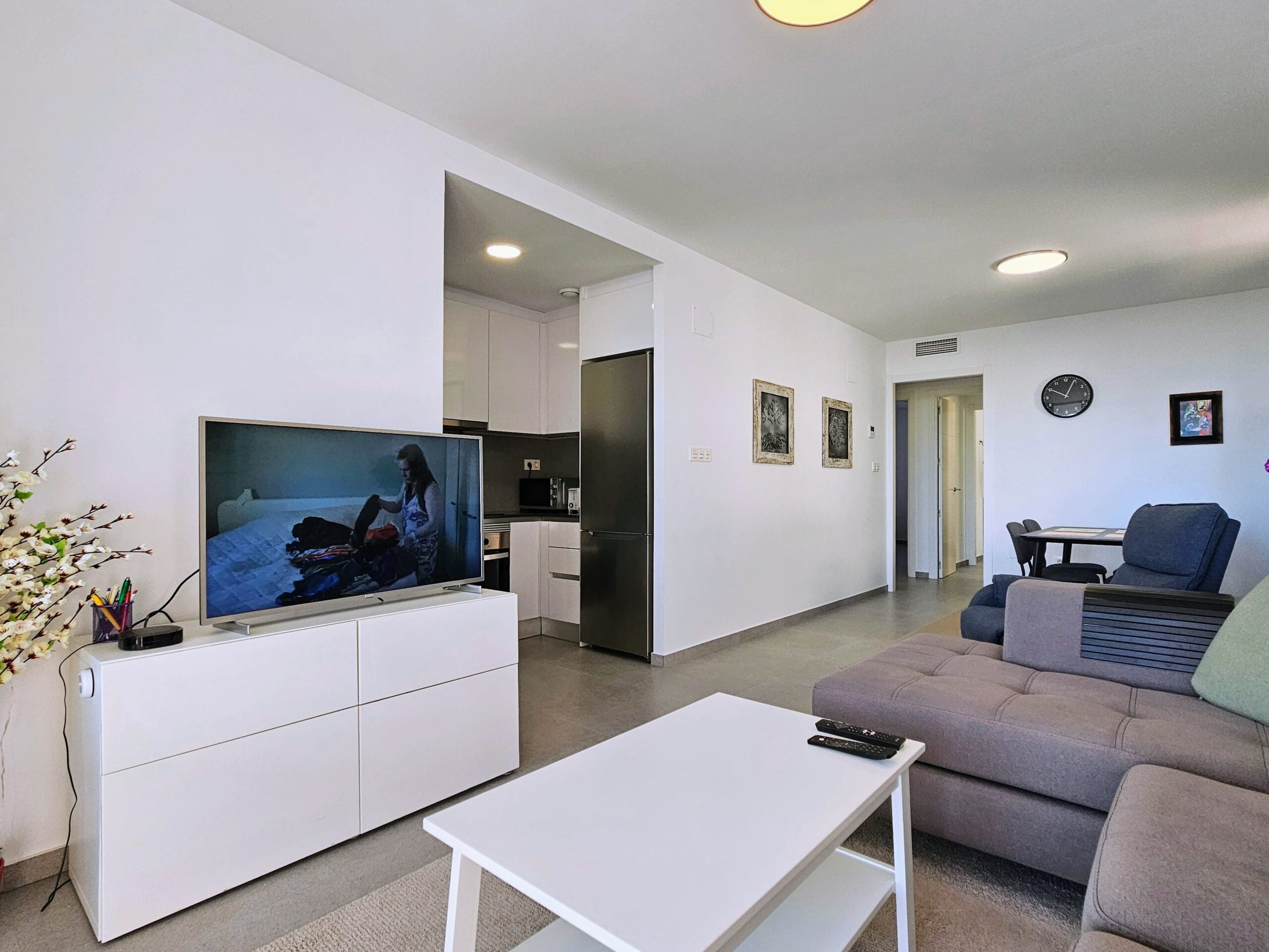 Asunnon keittiö on moderni ja hyvin varusteltu, olohuone on tilava, ja isot lasiovet päästävät sisään paljon luonnonvaloa. Tilavalla parvekkeella on mukava ihailla ympäristön maisemia, aina Välimerelle asti. Makuuhuoneissa on sisäänrakennetut vaatekaapit, päämakuuhuoneessa on oma en-suite kylpyhuone, toisessa makuuhuoneessa on vuodesohva.