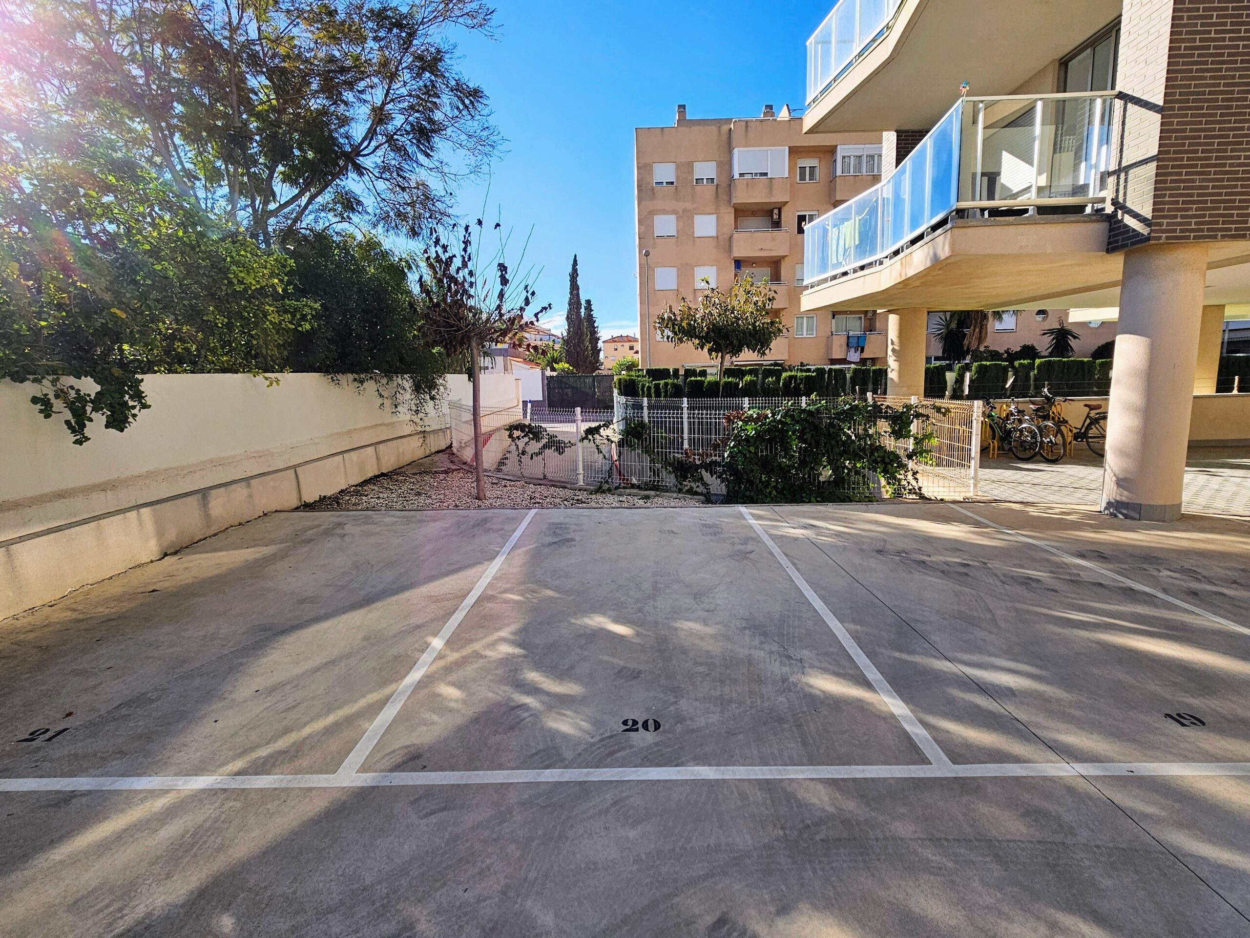 Oma autopaikka (nro 20) sähkötoimisen portin suojissa.