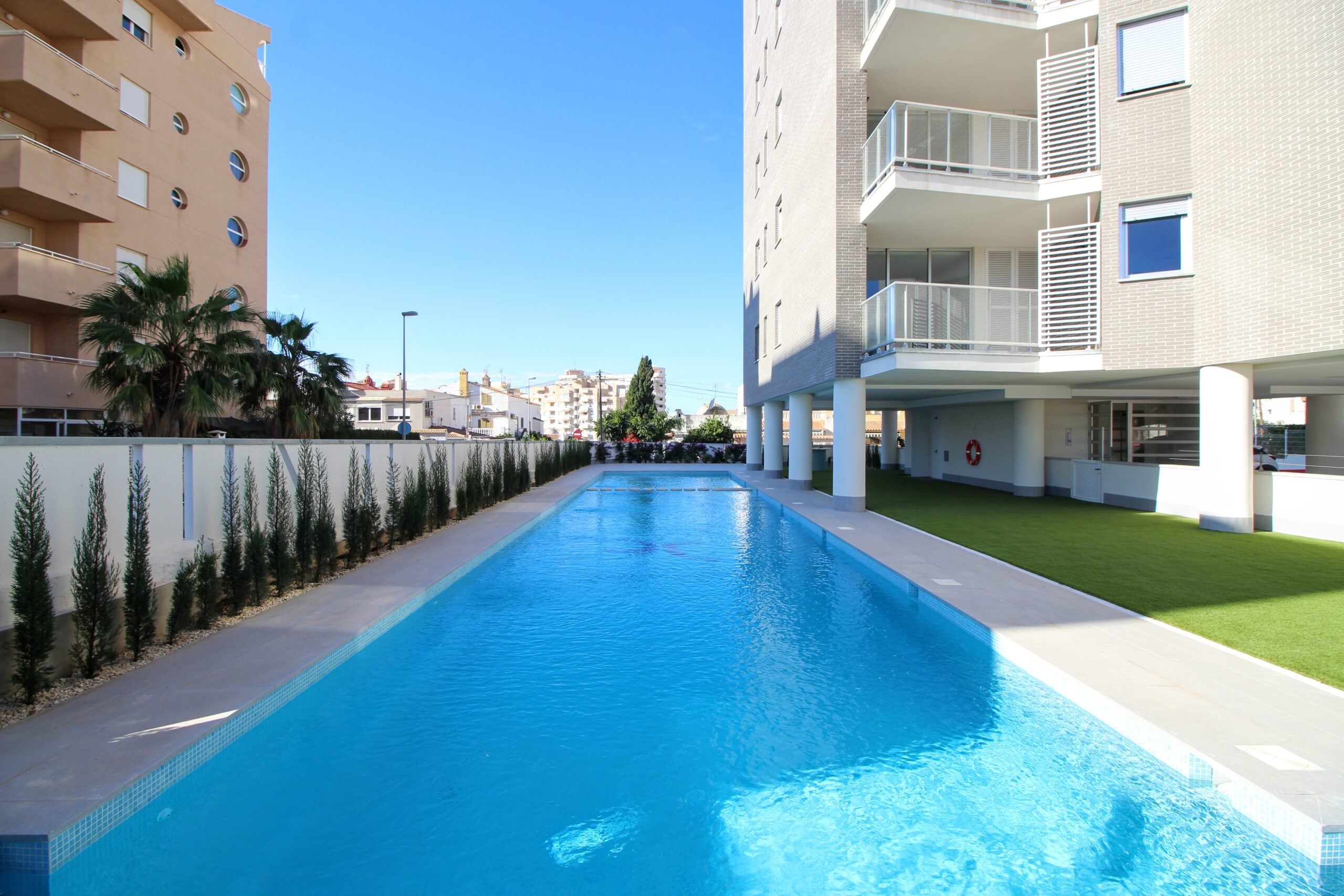 Taloyhtiön isolla altaalla on mukava viettää aurinkoista kesäpäivää.